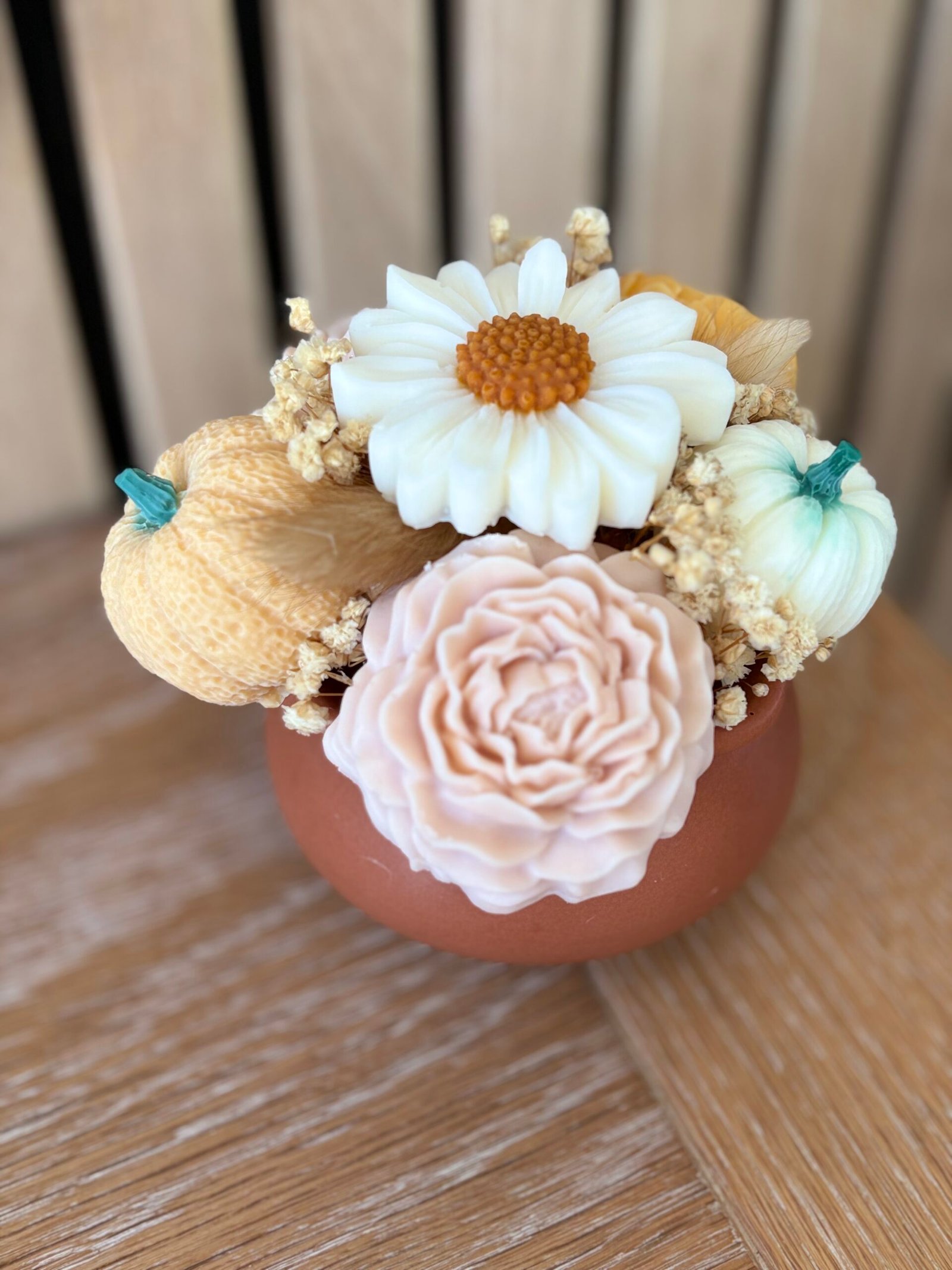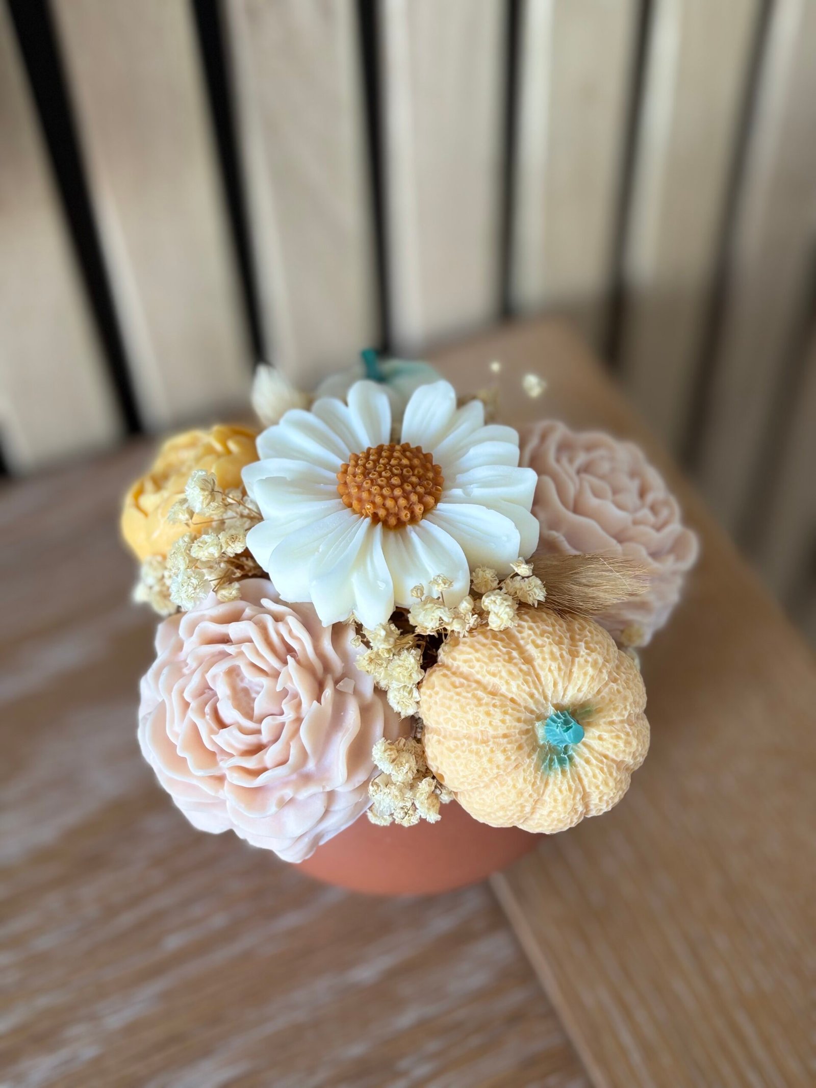 Un bouquet éternel aux couleurs de l’automne, où citrouilles et fleurs s’unissent dans une danse poétique. Ce bouquet automnal parfumé qui se transforme en fondants, pour une ambiance chaleureuse et réconfortante.