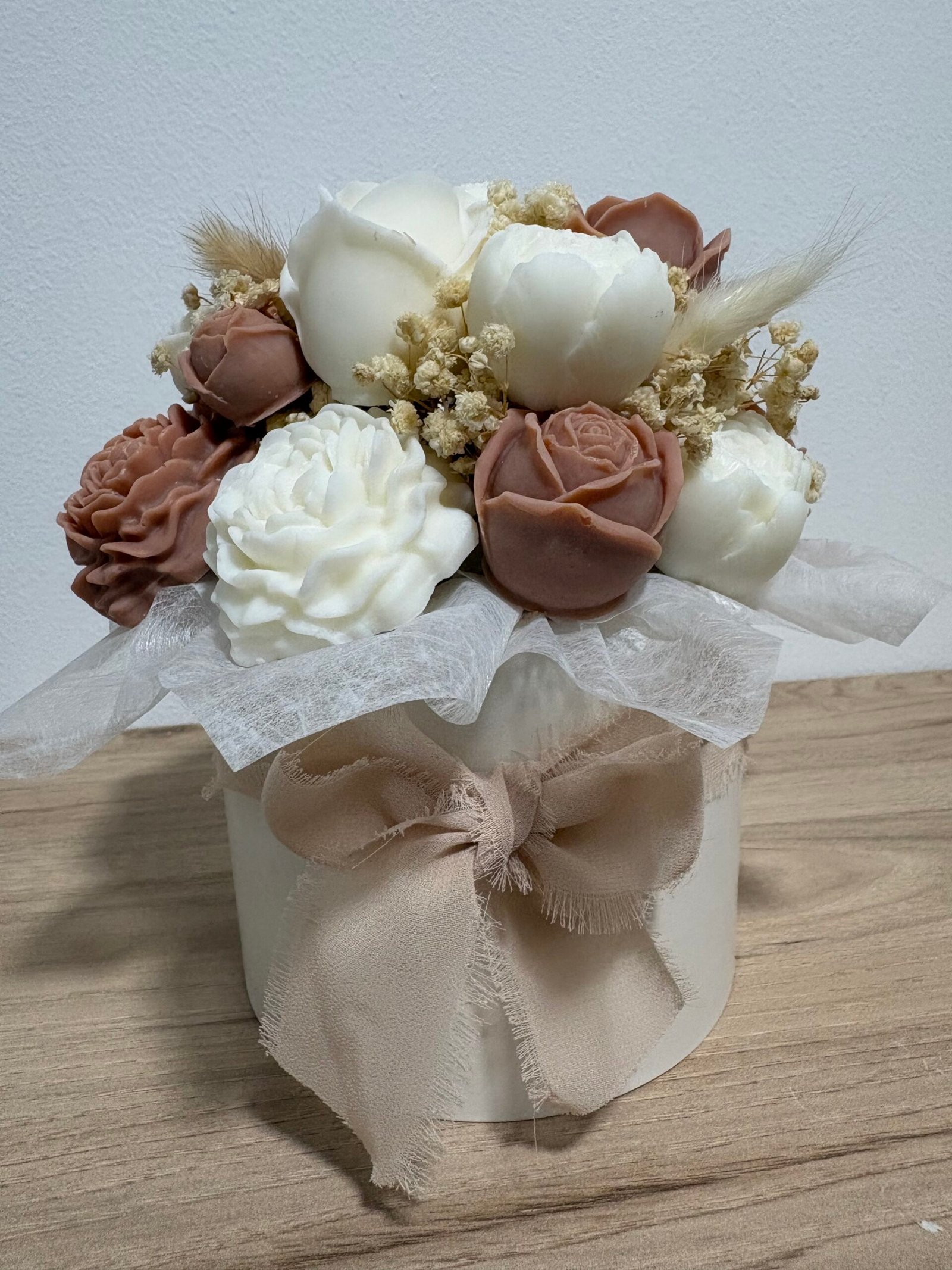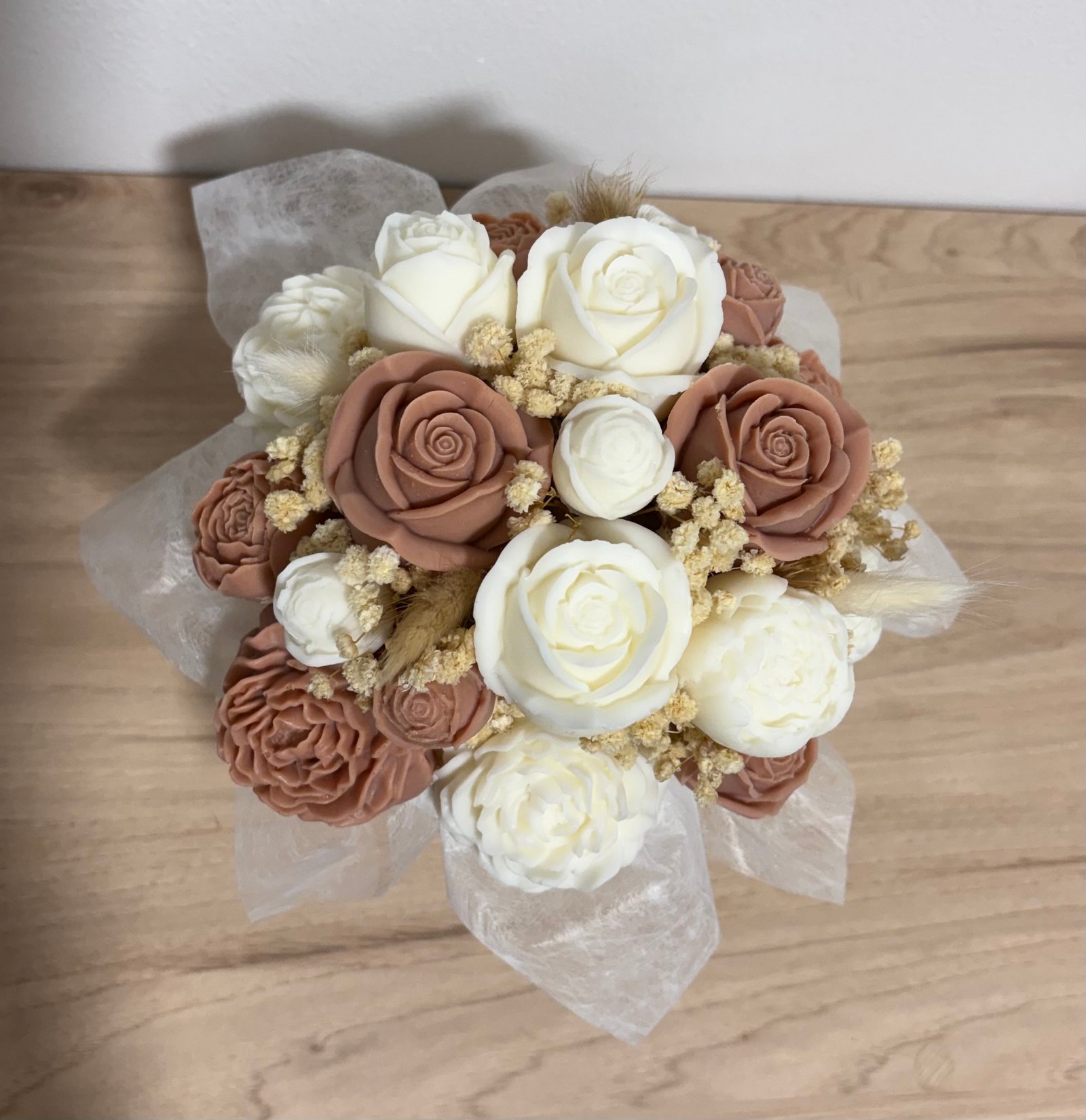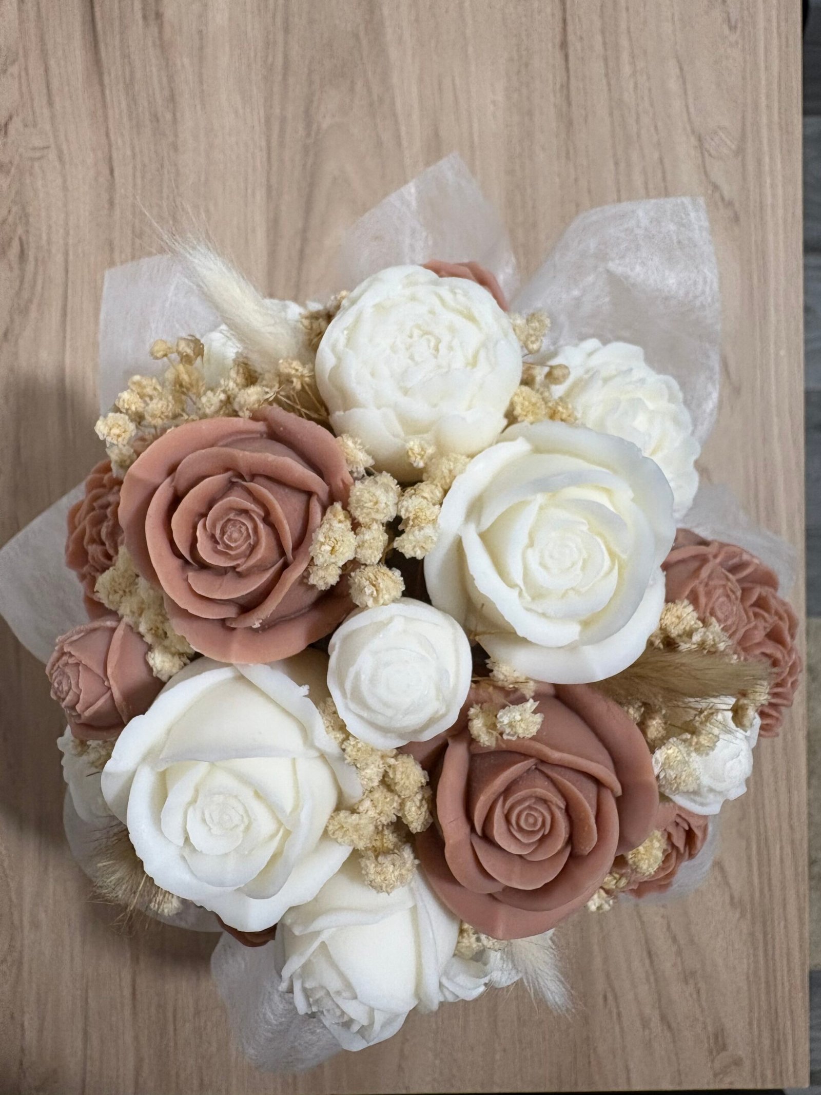 💐 Un grand bouquet de 19 fondants parfumés : roses et pivoines en cire de soja. Parfait pour un cadeau inoubliable ou une déco florale raffinée.